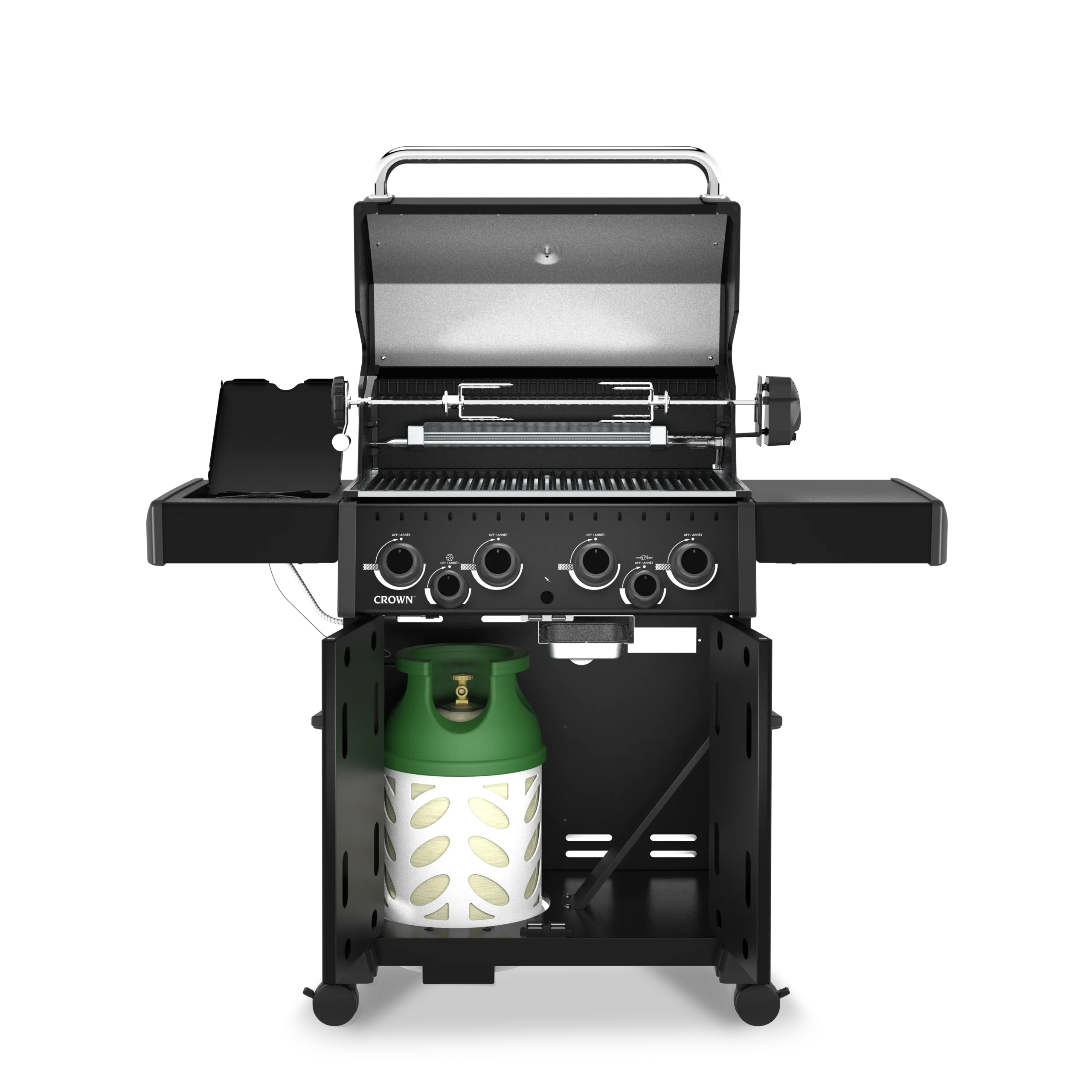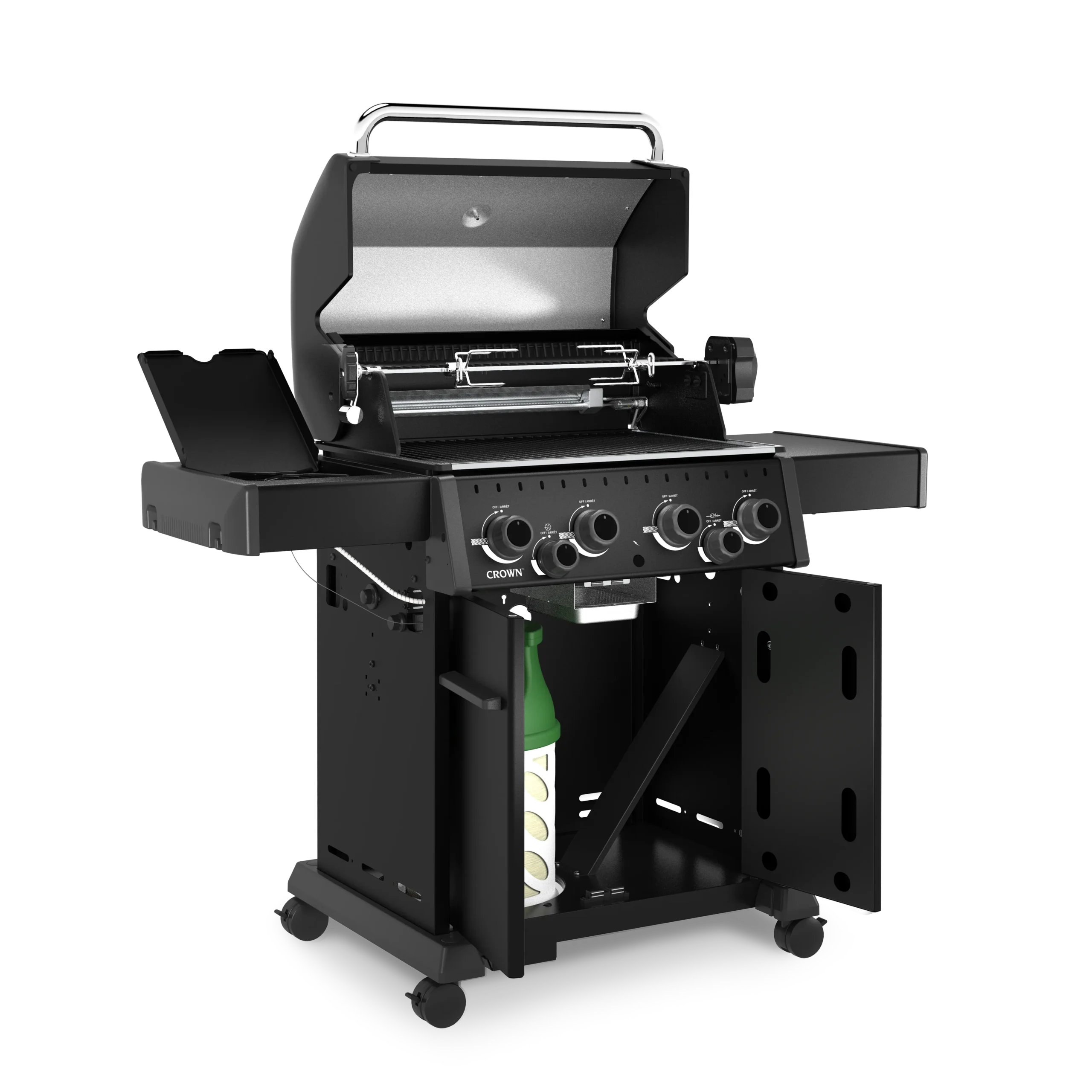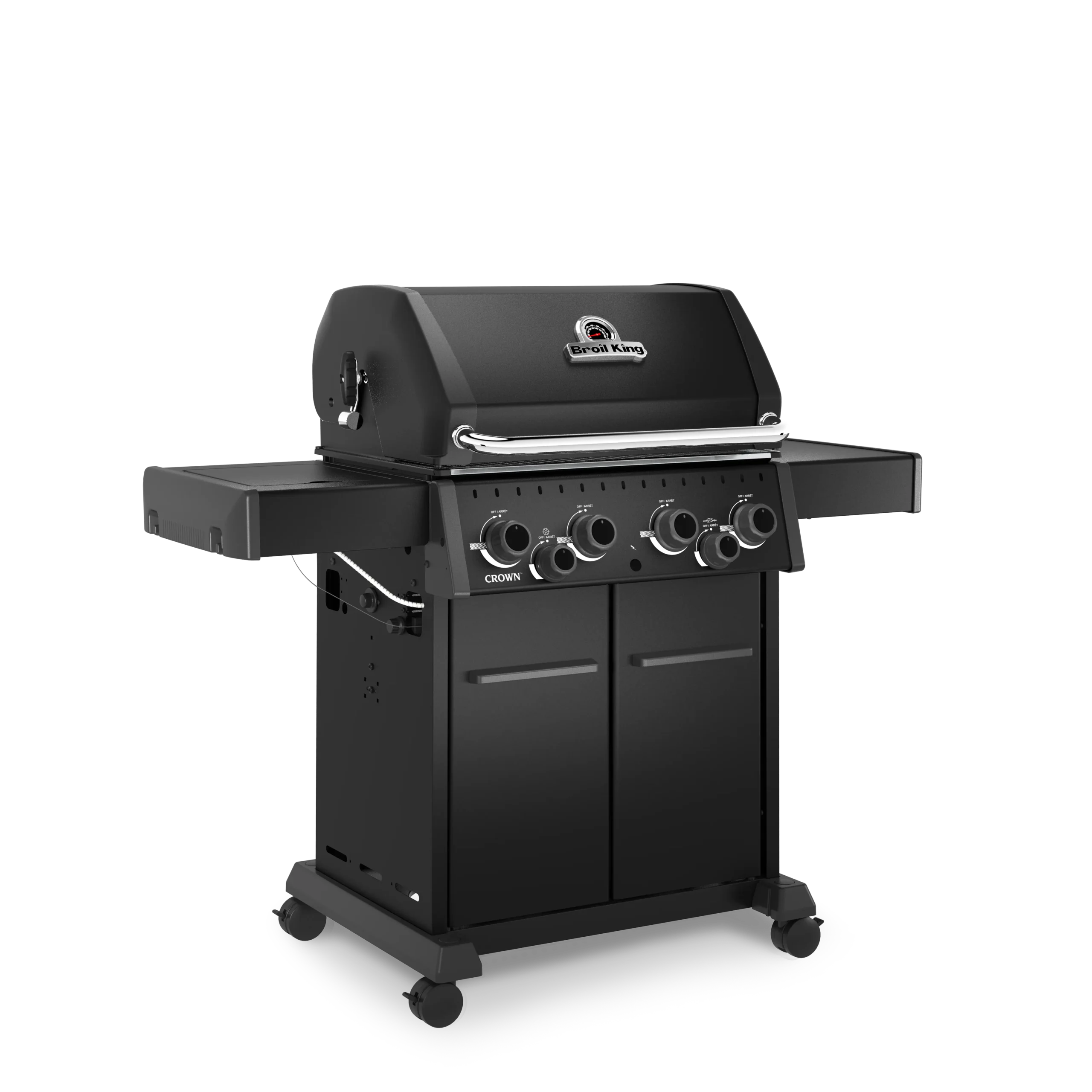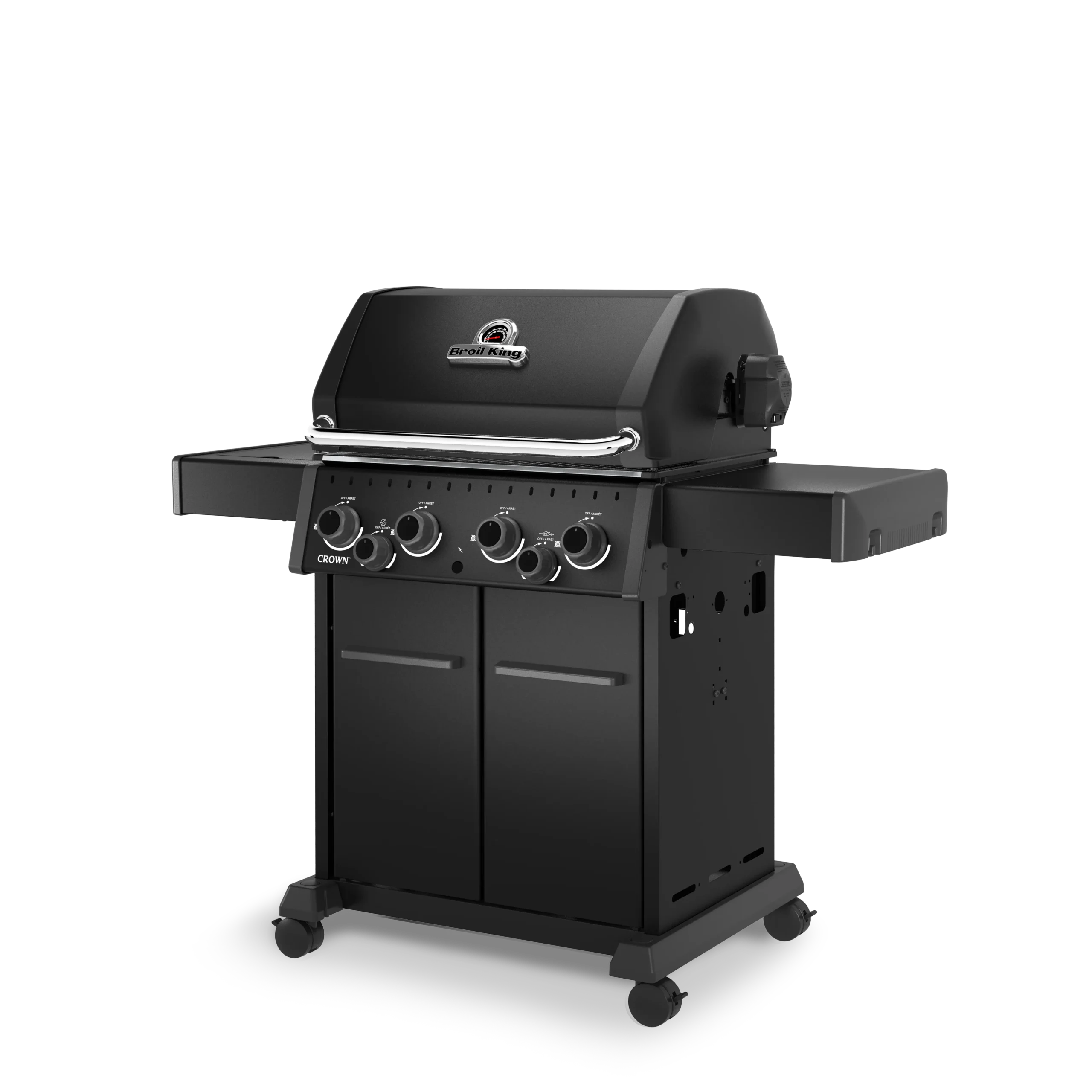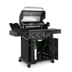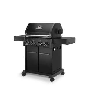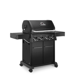 Broil King Crown™ 490 SHADOW je vsestranski plinski žar s 4 gorilniki, stranskim kuhalnikom in dodatnimi funkcijami za popolno peko na žaru.