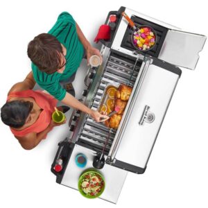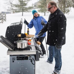Izdelan je iz visokokakovostnih materialov, ki so odporni na vremenske vplive. Elektronski vžig olajša zagon, vgrajen termometer pa omogoča natančen nadzor nad temperaturo. Prostorna omarica nudi dodaten prostor za shranjevanje pripomočkov.