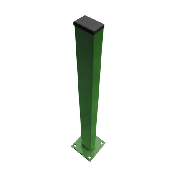 Steber za panel 60 × 40 mm z podstavkom v zeleni barvi RAL 6005 za hitro in stabilno montažo panelnih ograj.